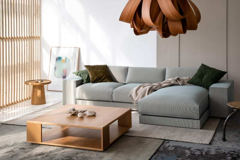 Muse offers a wide range of cosy modular sofas, including armchairs, ottomans, recliners, round pouffes, benches, and coffee tables, all with a homely feel. A notable characteristic of this collection is the soft, geometrically shaped cushions integrated into the sofa and armchair backrests and armrests. These cushions are seamlessly sewn together with the furniture's body. The seats are supported by either oak wood legs in a natural hue or black-painted steel.