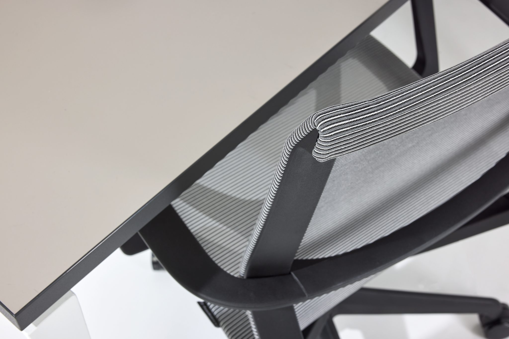 25mm (1 “) white MFC with 2mm (0.08 “) ABS edge, can be ordered in other colours (POA). Cable scallop on rear edge of desk top.